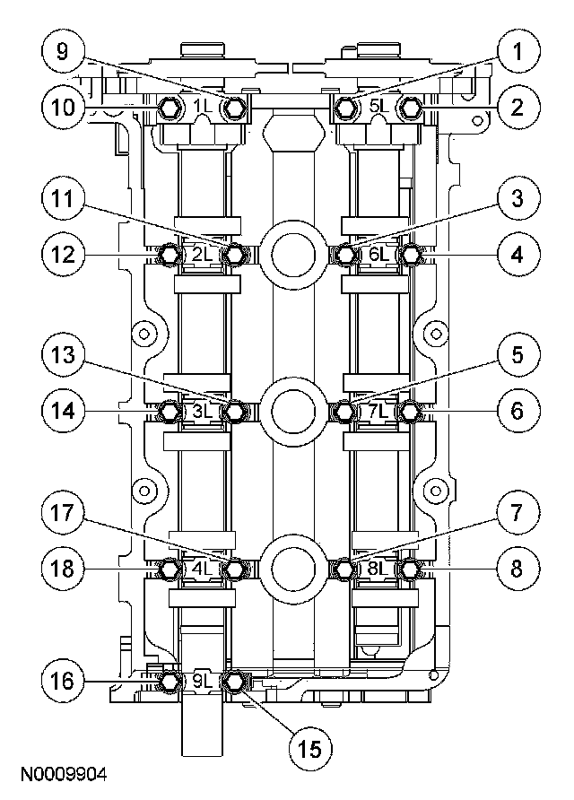 Lubricate the camshaft journal caps with clean engine oil. Position the LH camshaft caps and install the bolts.