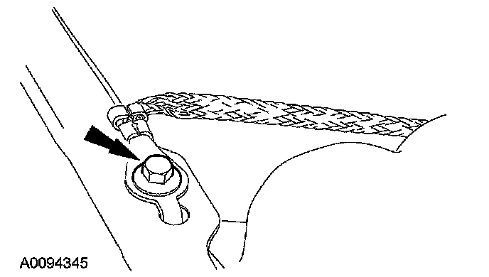 12. Remove the bolt and detach the ground strap from the RH fender.