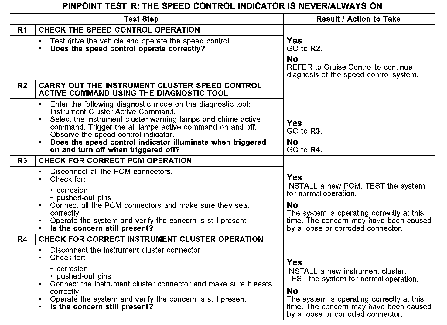 PINPOINT TEST R: THE SPEED CONTROL INDICATOR IS NEVER/ALWAYS ONR1-R4: