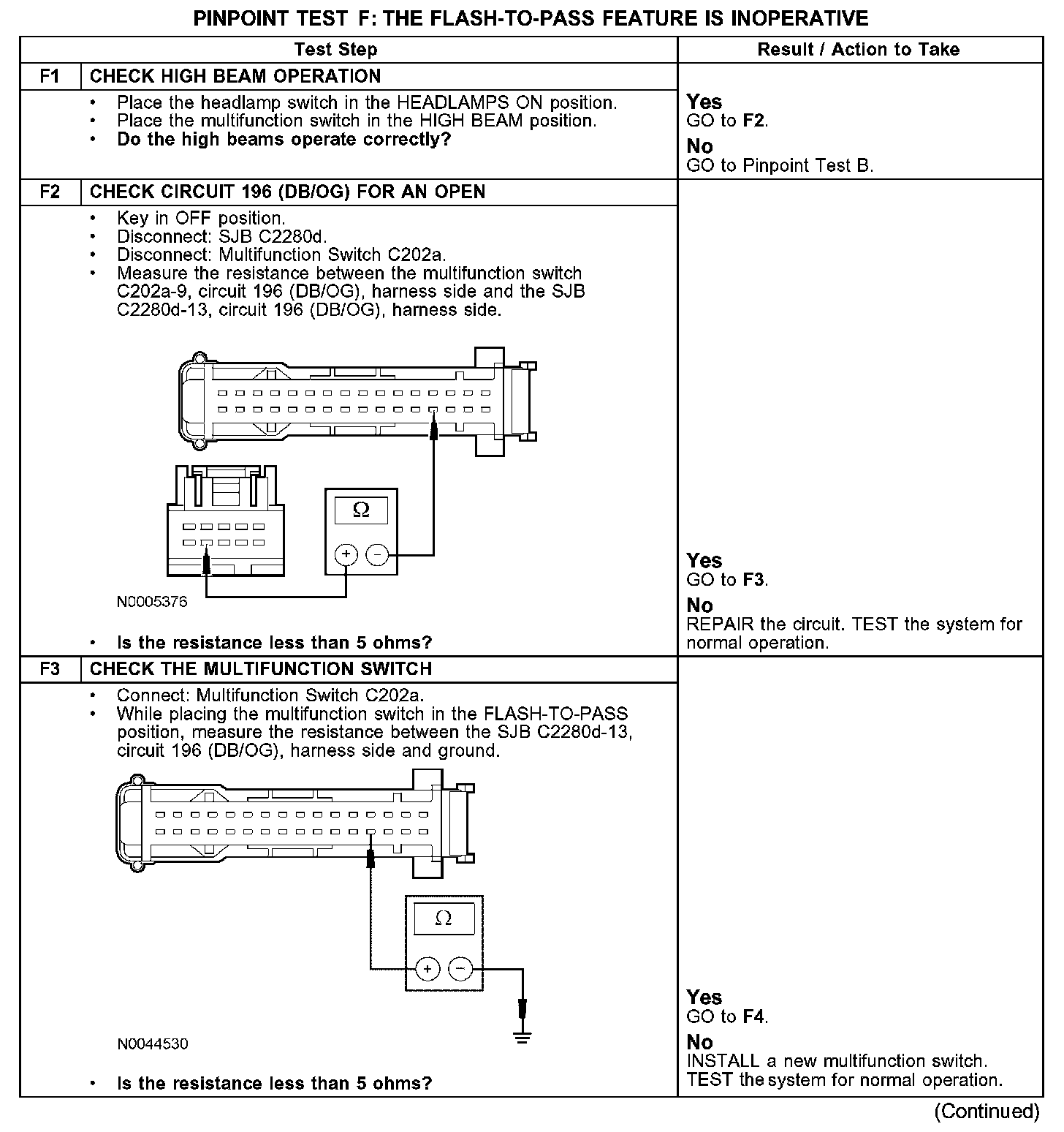 The smart junction box (SJB) sends a voltage reference signal to the multifunction switch through circuit 196 (DB/OG). When the multifunction switch is placed in the FLASH-TO-PASS position, the multifunction switch routes the signal to ground.