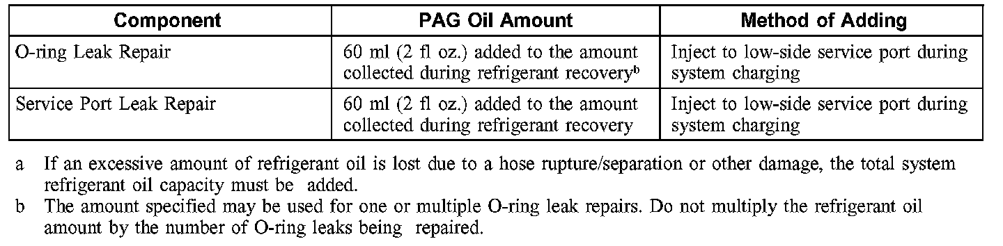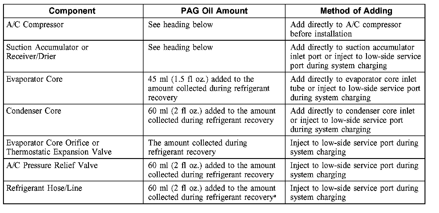 CAUTION: During normal A/C operation, oil is circulated through the system with the refrigerant, and a small amount is retained in each component. If certain components of the system are removed, some of the refrigerant oil will go with the component. To maintain the original total oil charge, it is necessary to compensate for the oil lost by adding oil to the system with the new part.