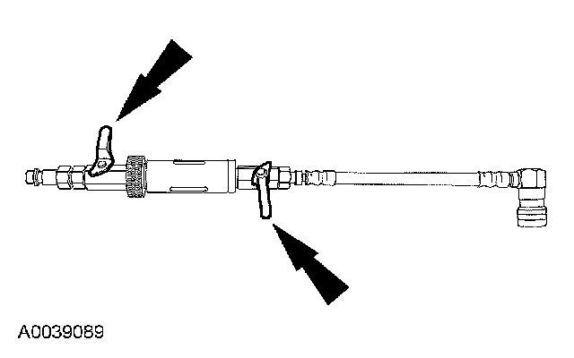 5. Install the dye/lubricant injector between the low-side service gauge port valve and the refrigerant service station or manifold gauge set.