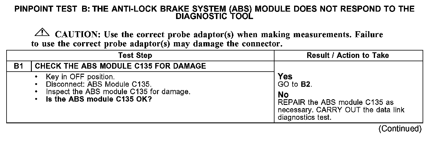 PINPOINT TEST B: THE ANTI-LOCK BRAKE SYSTEM (ABS) MODULE DOES NOT RESPOND TO THE DIAGNOSTIC TOOLB1: