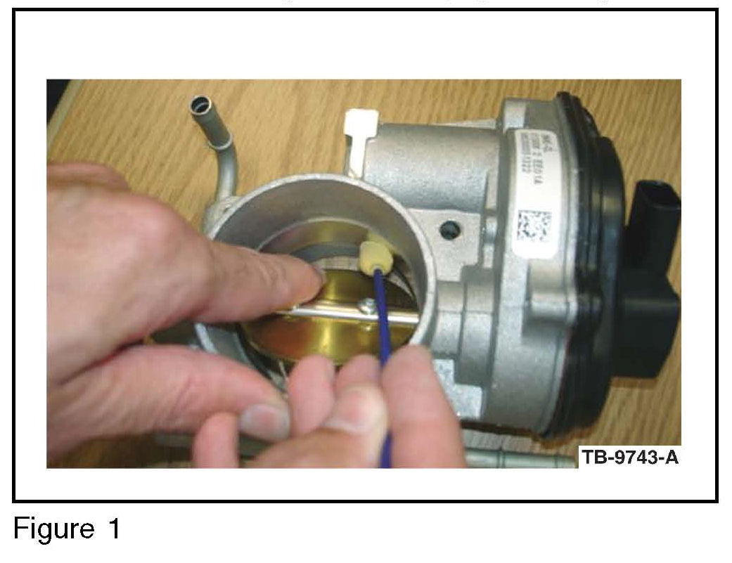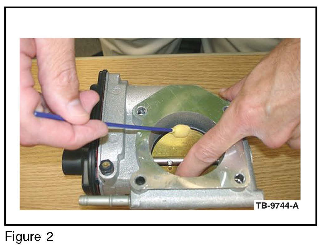 8. Using Motorcraft(R) Choke and Linkage Cleaner or equivalent, spray the throttle body plate and bore. Using a small, soft, solvent resistant brush, clean the edges of the throttle plate and the mating sur[ace of the throttle bore to remove all engine deposit build up. Reapply choke and linkage cleaner. (Figures 1-2)