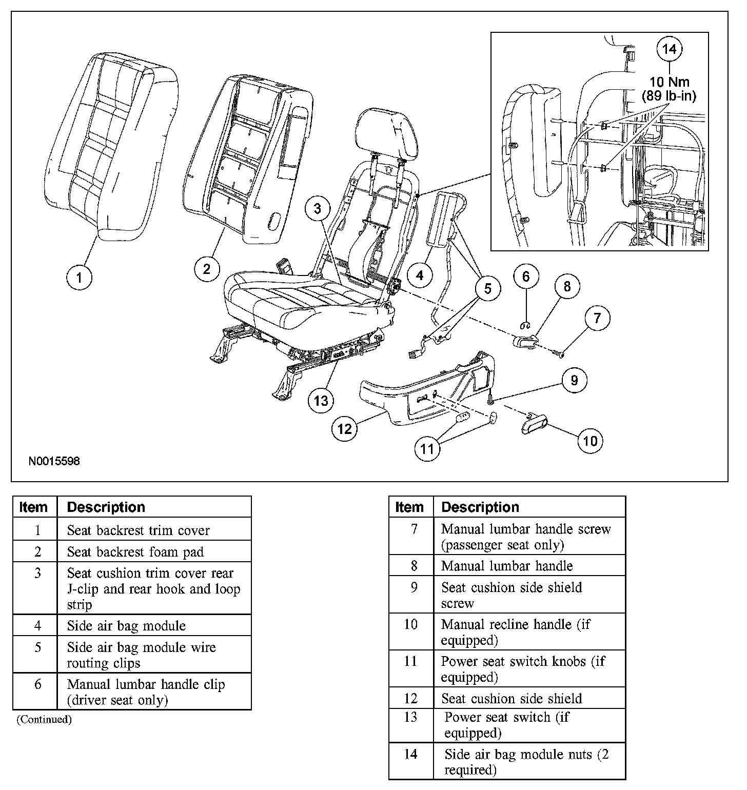 14. WARNING: Front seat back trim covers installed on seats equipped with side air bags cannot be repaired; they are to be replaced (cleaning is permissible).