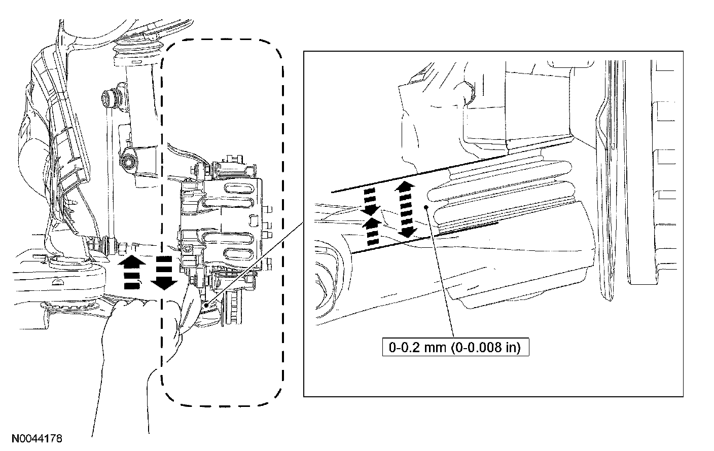 4. CAUTION: Do not use any tools or equipment to move the wheel and tire assembly or suspension components while checking for relative movement. Suspension damage can occur. The use of tools or equipment will also create relative movement that may not exists when using hand force. Relative movement must be measured using hand force only.