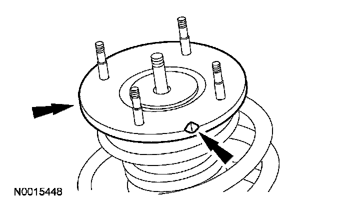 - position the notch and arrow on the upper strut mount outboard opposite the locator tab on the strut.