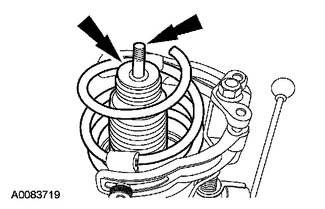 Using a suitable spring compressor, slightly compress the spring to remove initial tension. While holding the strut rod, loosen the nut. Continue to compress the spring until tension is relieved.