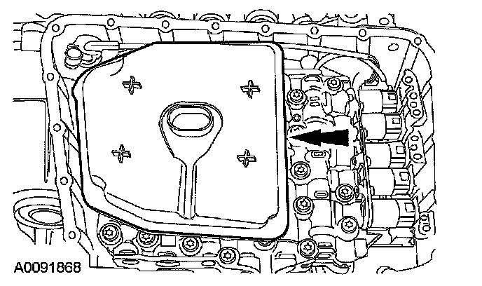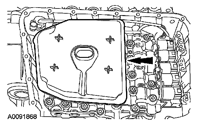 CAUTION: Make sure that the transmission fluid filter is fully seated into the bore. If the filter is not correctly installed, internal transaxle damage will occur.