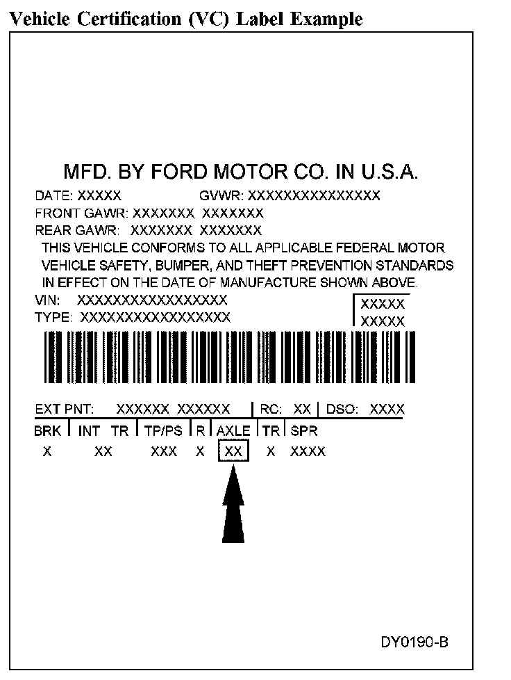 The vehicle certification (VC label is located in the driver door jamb. The axle code is on the VC label. For additional information on the VC label, refer to Vehicle/Application and ID.