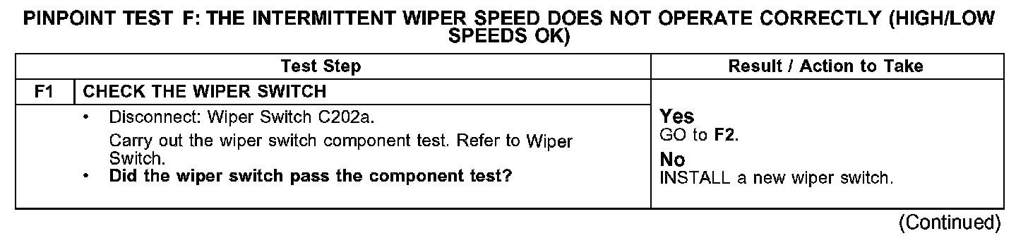 PINPOINT TEST F: THE INTERMITTENT WIPER SPEED DOES NOT OPERATE CORRECTLY (HIGH/LOW SPEEDS OK)F1: