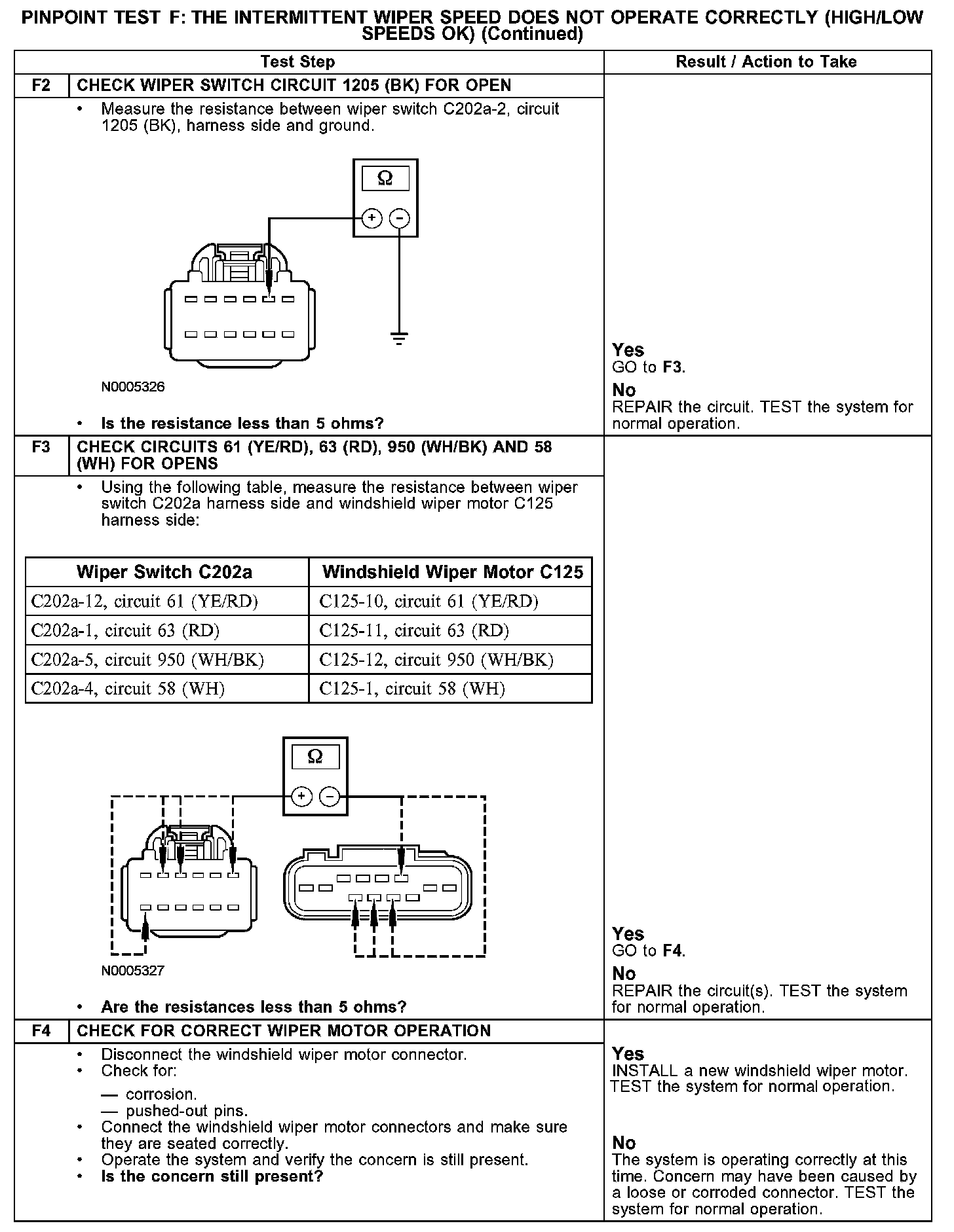 Under normal operation, the windshield wiper motor receives power through circuit 1671 (RD) and is grounded through circuits 1203 (BK/LB) and 1205 (BK). The front wiper motor receives open and ground inputs from the wiper switch through circuits 58 (WH), 61 (YE/RD), 63 (RD) and 950 (WH/BK) to activate the windshield wipers to the selected speeds.