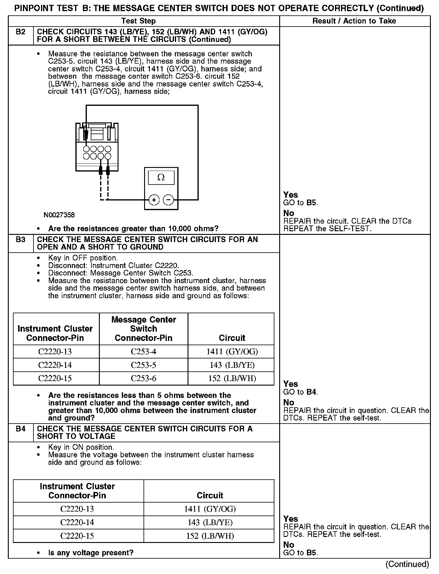 The message center functionality is controlled through the message center switches, which are hardwired to the instrument cluster. The instrument cluster monitors the message center switch input by sending reference signals through circuits 143 (LB/YE) and 152 (LB/WH). The message center switch return signal is routed back to the instrument cluster through circuit 1411 (GY/OG).