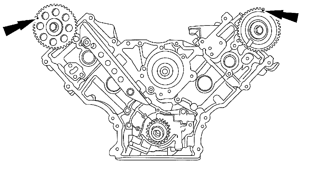 20. Rotate the RH camshaft sprocket until the timing mark is approximately at the 11 o'clock position. Rotate the LH camshaft sprocket until the timing mark is approximately at the 12 o'clock position.