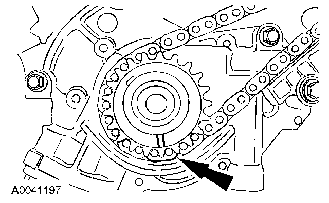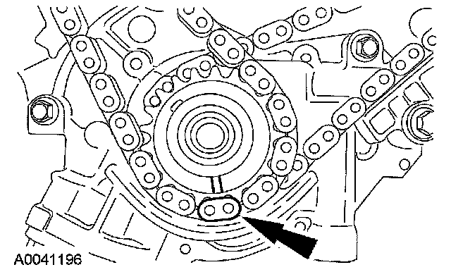 21. Position the LH (inner) timing chain on the crankshaft sprocket, aligning the copper (marked) link with the timing mark on the sprocket.