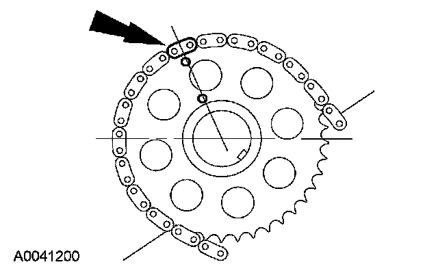 22. Install the LH timing chain on the camshaft sprocket, aligning the copper (marked) link with the timing marks on the sprocket.