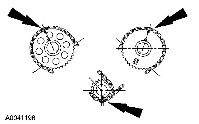 25. Position the RH (outer) timing chain on the crankshaft sprocket, aligning the copper (marked) link with the timing mark on the sprocket.