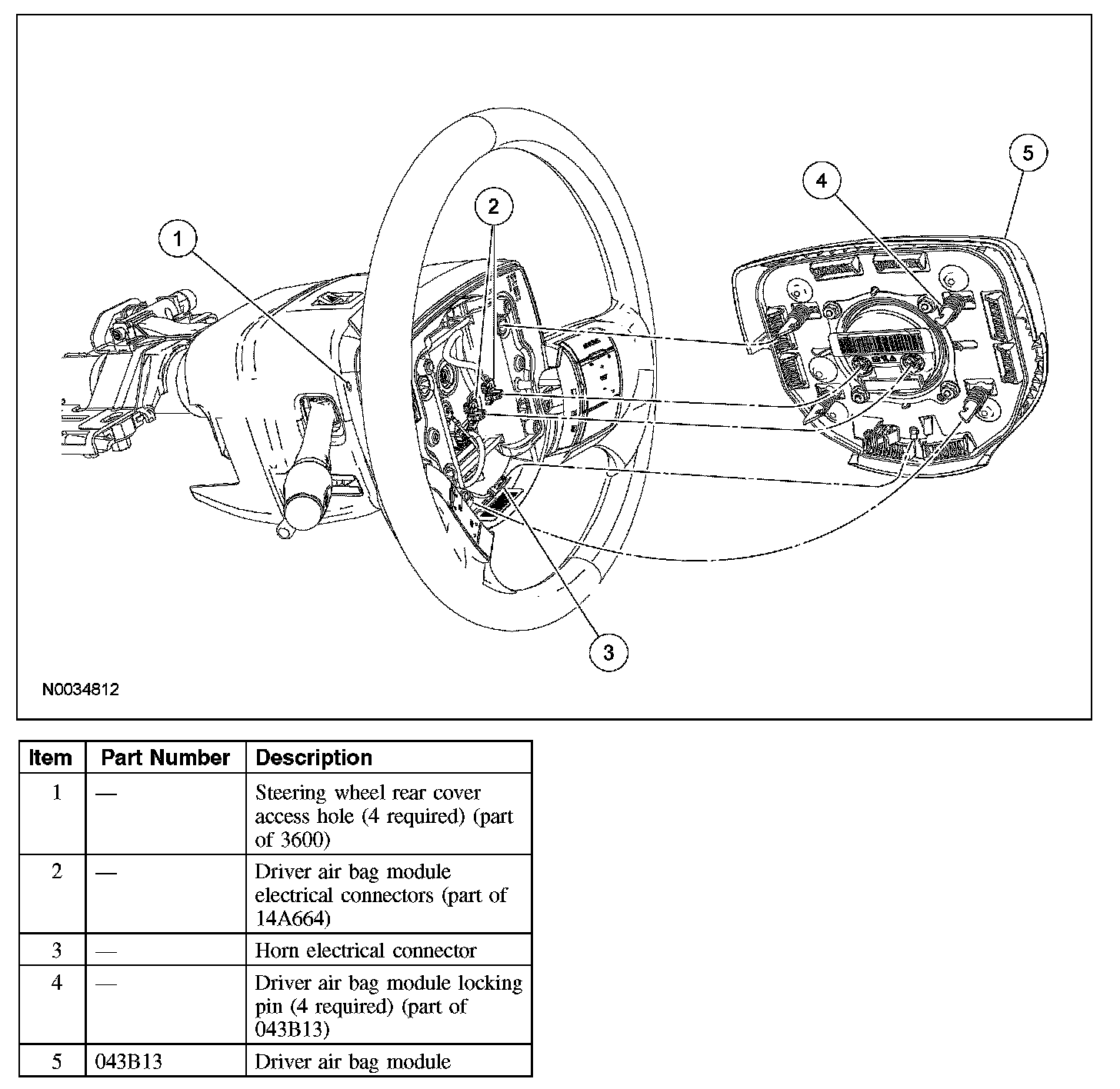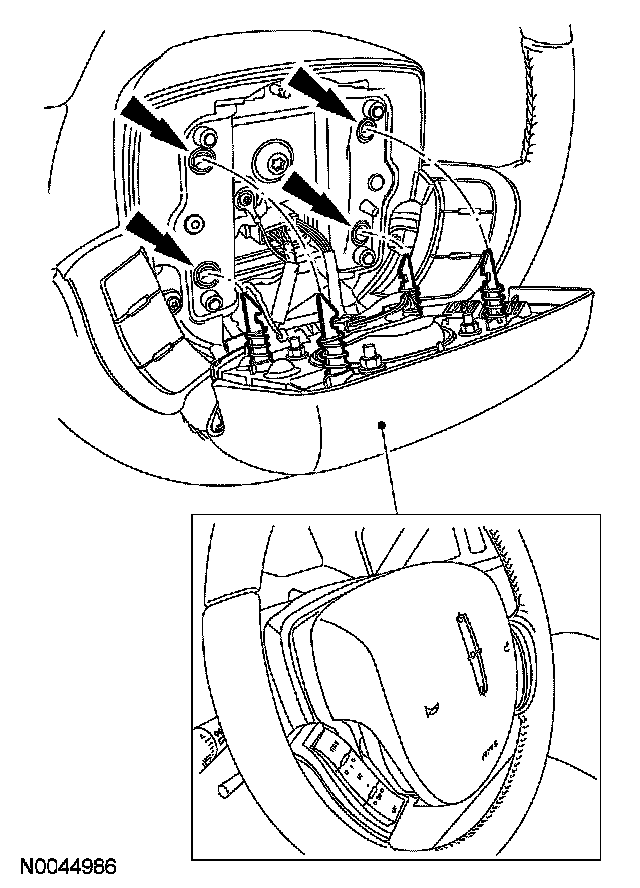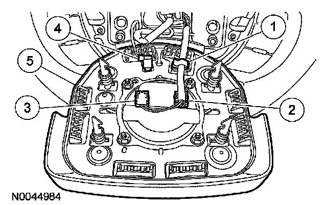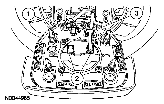 CAUTION: Make sure the steering wheel spring clips retaining the driver air bag module are disengaged from each of the 4 locking pins on the driver air bag module before removing the driver air bag module from the steering wheel. Failure to do so will damage the driver air bag module and steering wheel.