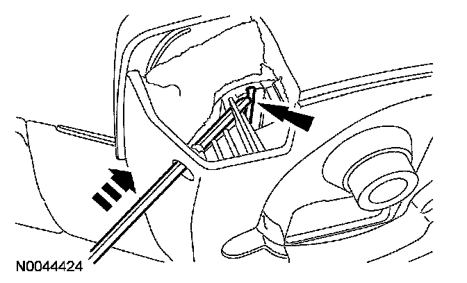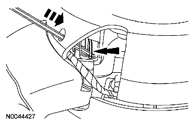 Push the tool deeper into the access hole (approximately 4-8 mm [0.15-0.31 in]) with enough force to disengage the steering wheel spring clip from the driver air bag module locking pin. The corresponding corner of the driver air bag module should pop up once the spring clip is disengaged from the locking pin. Gently pull the corresponding corner of the driver air bag module to make sure the locking pin does not reengage the spring clip. Remove the tool from the access hole. Discontinue pulling on the corresponding corner of the driver air bag module.