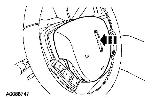 Push the tool deeper into the access hole (approximately 3-6 mm [0.11-0.23 in]) with enough force to disengage the steering wheel spring clip from the driver air bag module locking pin. The corresponding corner of the driver air bag module should pop up once the spring clip is disengaged from the locking pin. Gently pull the corresponding corner of the driver air bag module to make sure the locking pin does not reengage the spring clip. Remove the tool from the access hole. Discontinue pulling on the corresponding corner of the driver air bag module.