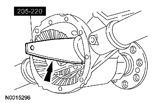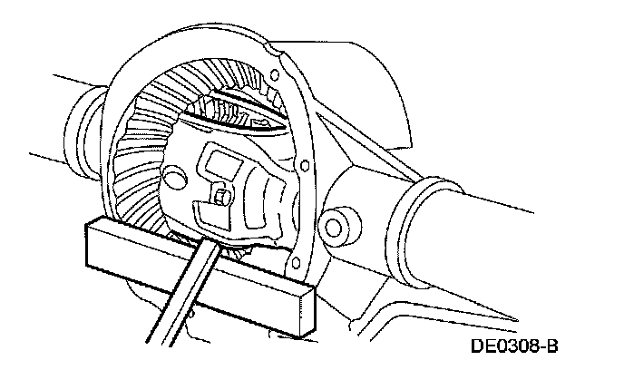 CAUTION: Place a wood block between the pry bar and the differential housing to protect the machined surface from damage.