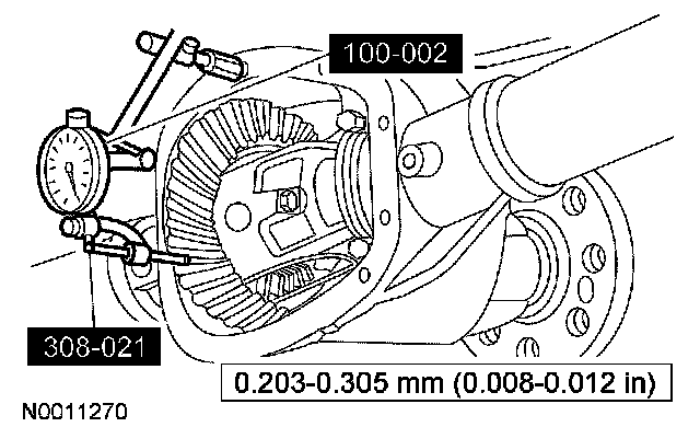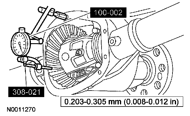 11. If a zero backlash condition occurs, add 0.51 mm (0.020 inch) to the RH side and subtract 0.51 mm (0.020 inch) from the LH side to allow backlash indication. Measure the backlash. Refer to Measuring backlash in this procedure.