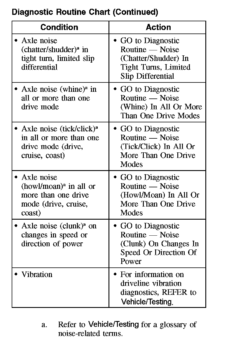 Certain rear axle and driveline concern symptoms are also common to the engine, transmission, rear wheel bearings and tire. For this reason, be sure the cause of the concern is in the axle before repairing or installing any axle components.