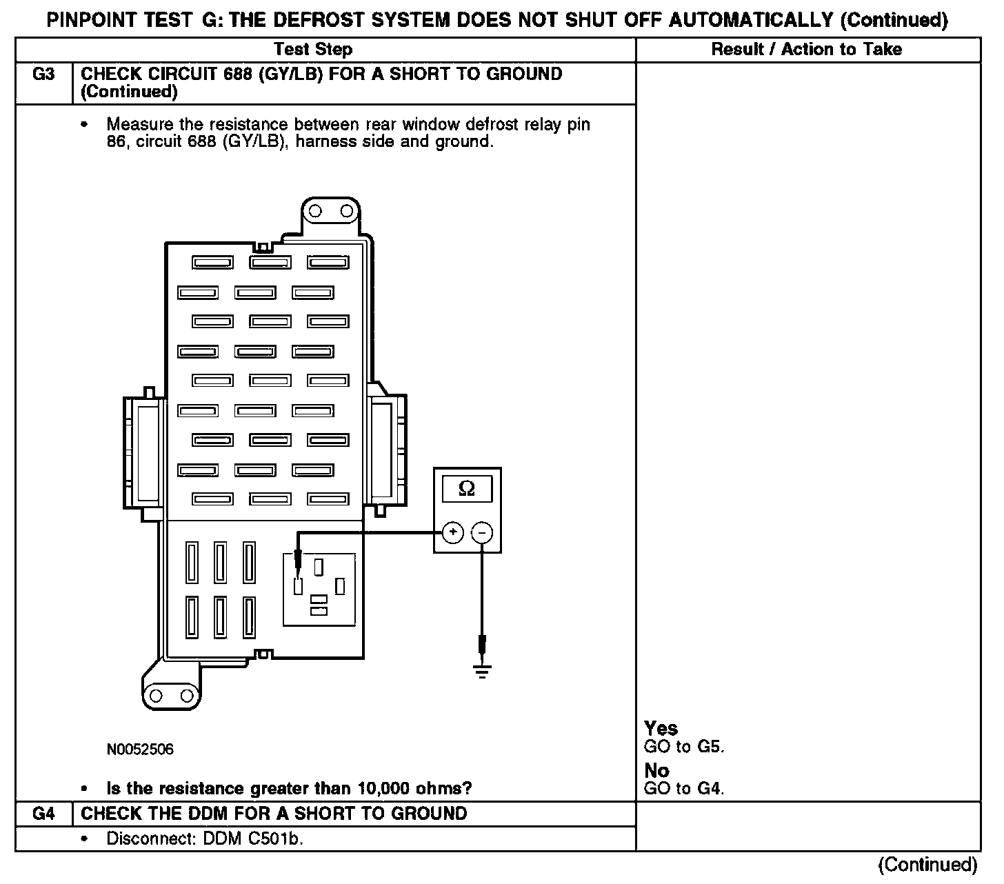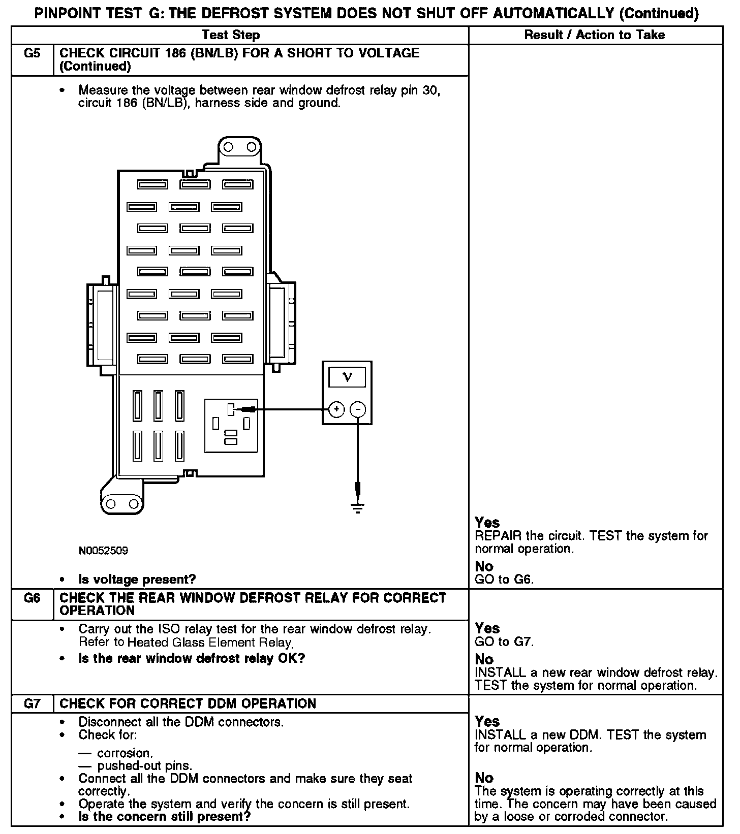The key must be in the START or RUN position for the heated rear window to operate. When the rear window defrost switch is pressed, a momentary ground is supplied to the driver door module (DDM) through circuit 1010 (DB/OG). The DDM provides a ground for the rear window defrost relay coil on circuit 688 (GY/LB). When the rear window defrost relay coil is energized, the relay switch closes, providing voltage to the heated rear window grid, the heated rear window indicator, and the heated exterior mirror (if equipped) through circuit 186 (BN/LB). The heated rear window grid and the rear window defrost switch are grounded through circuit 57 (BK).