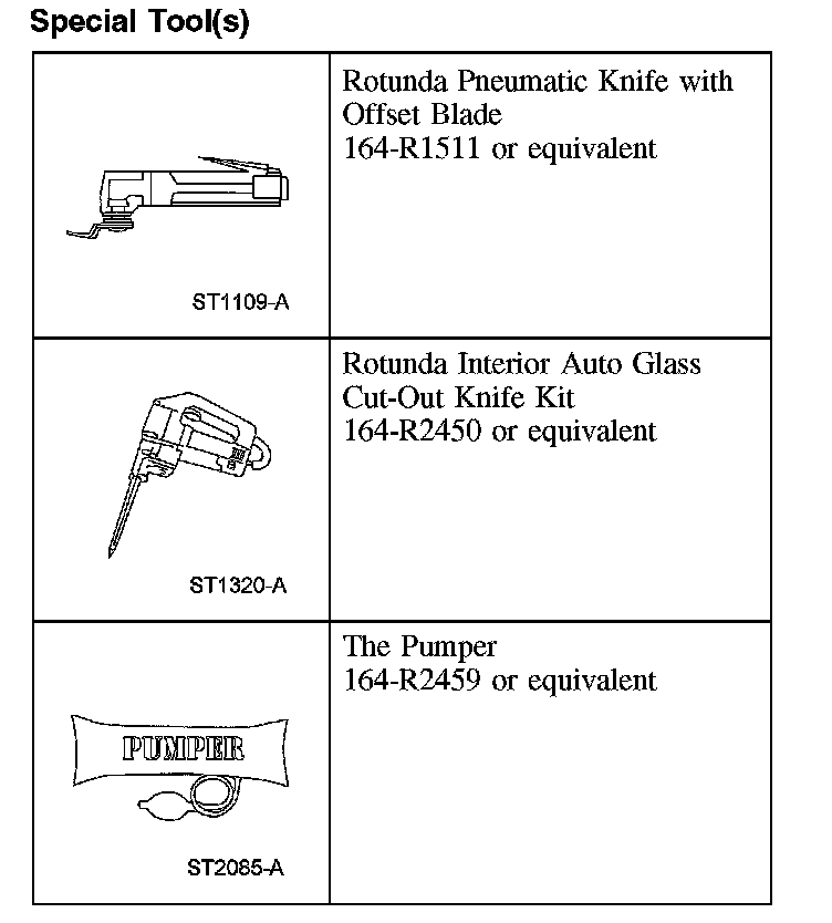 WARNING: To prevent glass splinters from entering the eyes or cutting the hands, wear safety glasses and heavy gloves when cutting the glass from the vehicle. Failure to follow these instructions may result in personal injury.