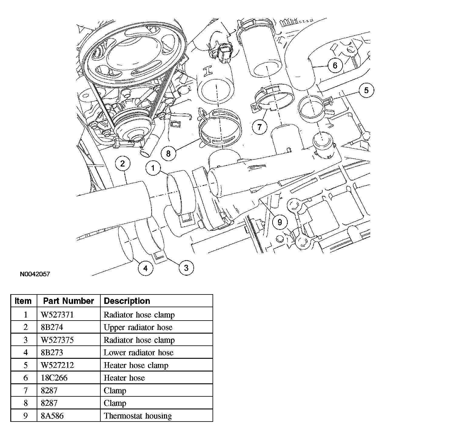 7. Reposition the 2 thermostat housing-to-engine hose clamps.