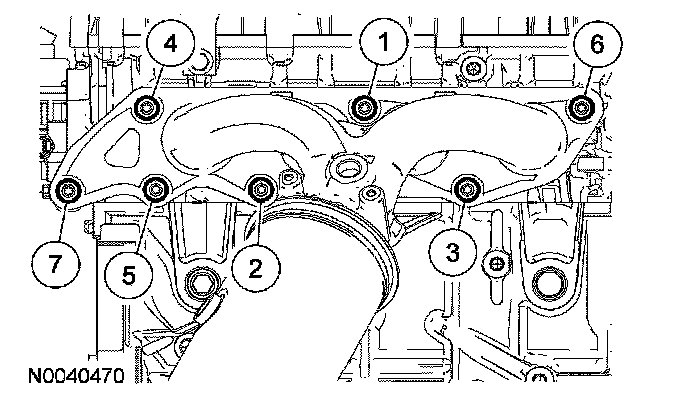 Position the catalytic converter manifold and tighten the 7 new nuts in the sequence shown, in 2 stages.