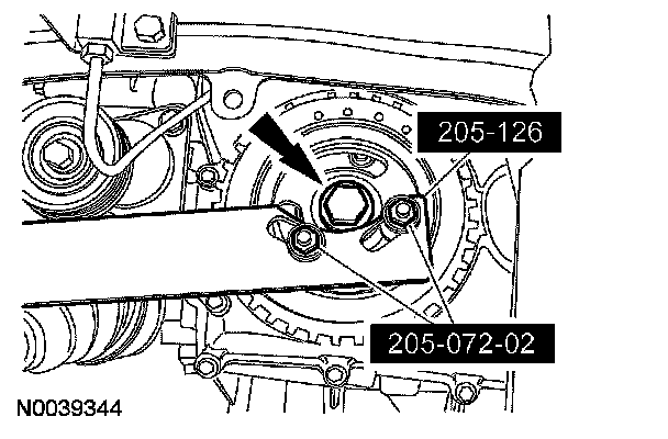 ^ Install a new crankshaft pulley bolt. Using the special tools to hold the crankshaft pulley in place, tighten the crankshaft pulley bolt in 2 stages:
