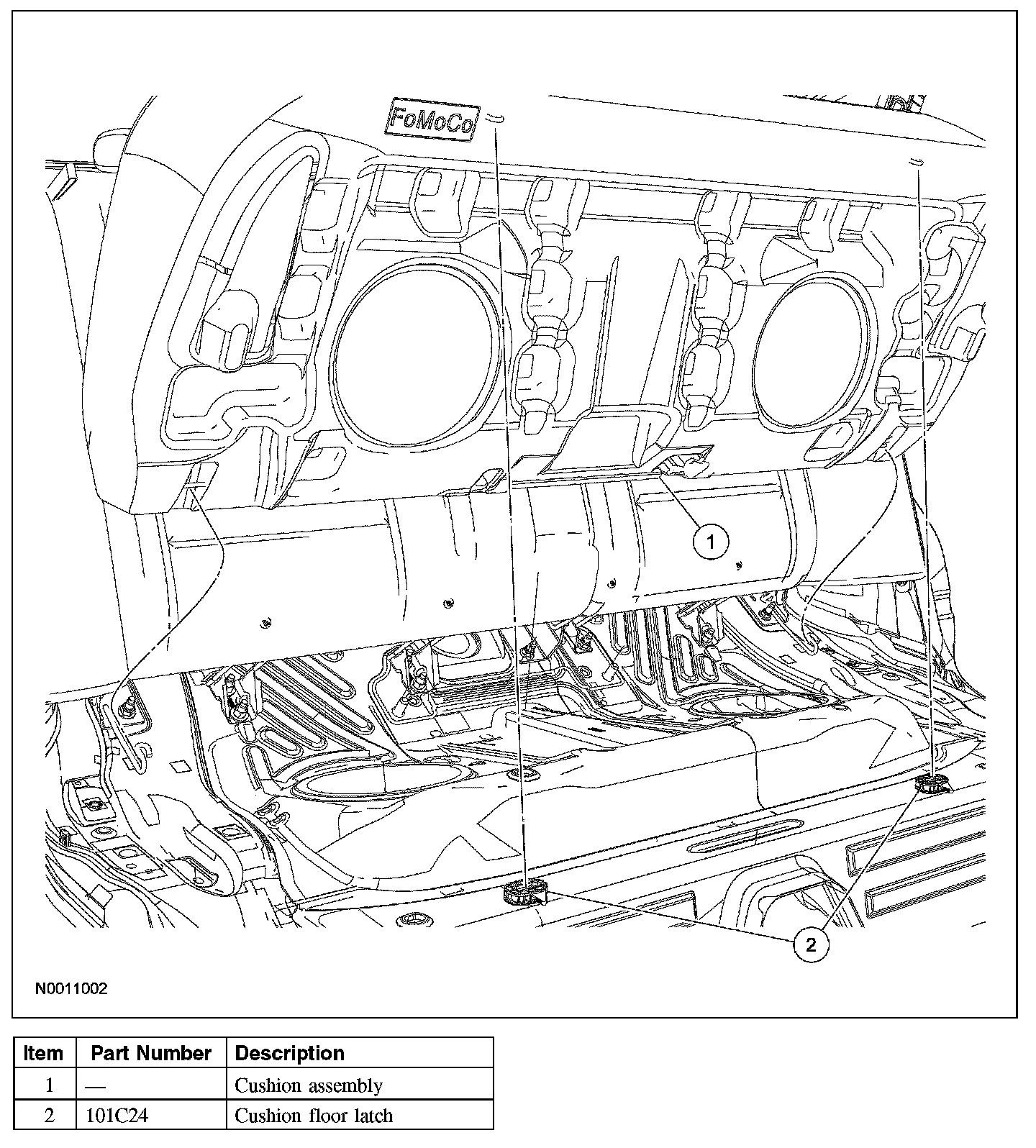 1. From under the front of the cushion assembly, push each of the 2 seat cushion floor latch release levers to the left of the vehicle. Lift up at the front and release the front of the cushion assembly.