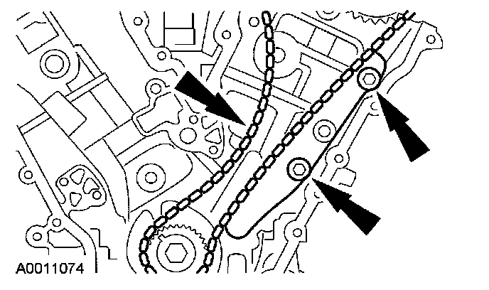 ^ Align the marks on the timing chain with the marks on the camshaft and crankshaft sprockets.
