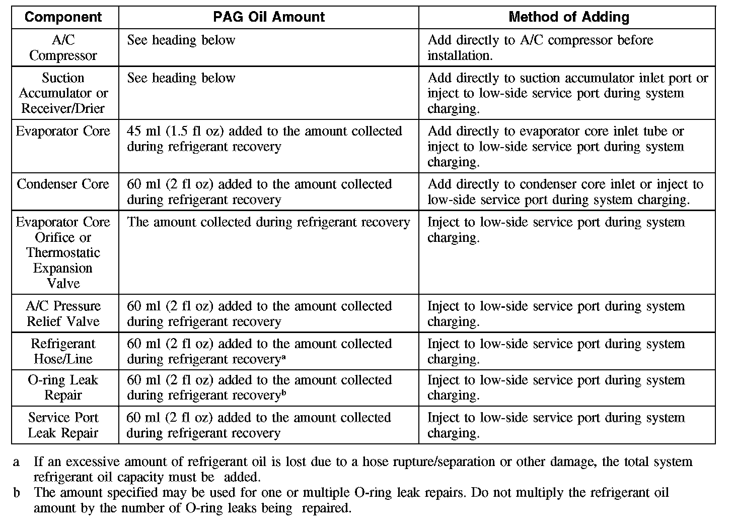 CAUTION: During normal A/C operation, oil is circulated through the system with the refrigerant, and a small amount is retained in each component. If certain components of the system are removed, some of the refrigerant oil will go with the component. To maintain the original total oil charge, it is necessary to compensate for the oil lost by adding oil to the system with the new part.