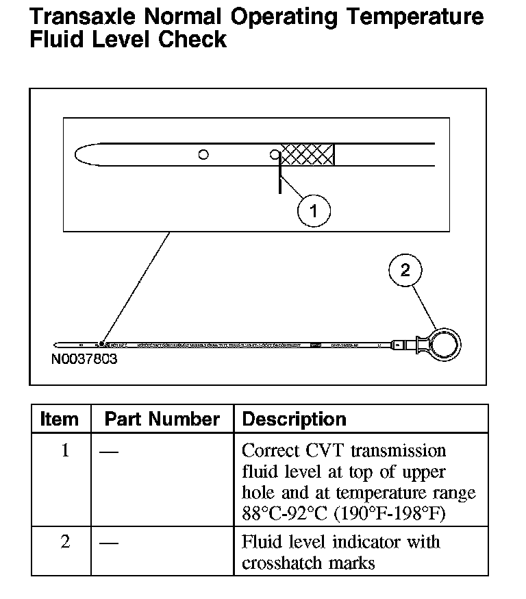 ^ With the CVT transmission fluid in the normal operating temperature range of 88 degrees C - 92 degrees C (190 degrees F - 198 degrees F), the minimum acceptable level would be at the bottom of the crosshatch mark on the fluid level indicator. The maximum acceptable level would be no higher than the top of the crosshatch, 12 mm (0.47 inch) from the top of the upper level setting hole area.