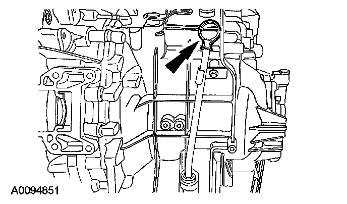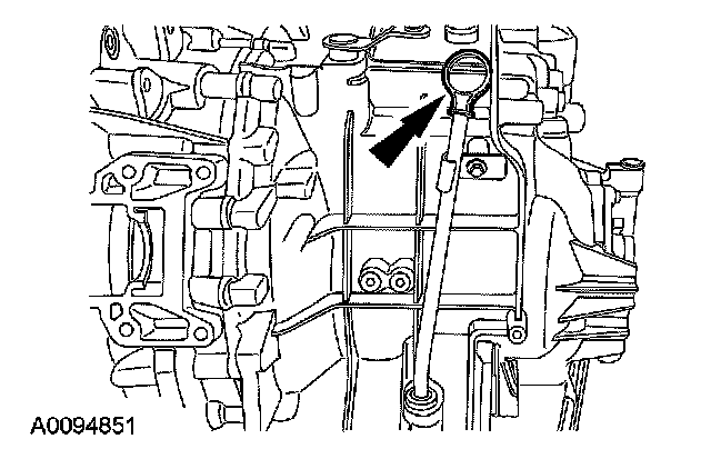 6. Remove the fluid level indicator and check for correct fluid level. The fluid level should be at the bottom of the top level indicator hole with the CVT automatic transmission fluid temperature in the 43 degrees C - 47 degrees C (109 degrees F - 117 degrees F) range.