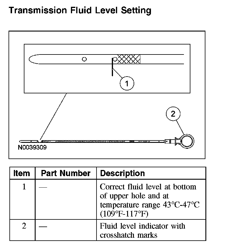 NOTE: This procedure is designed for checking the fluid level on a vehicle that has just come off the road with the transmission fluid in the normal operating range of 88 degrees C - 92 degrees C (190 degrees F - 198 degrees F).