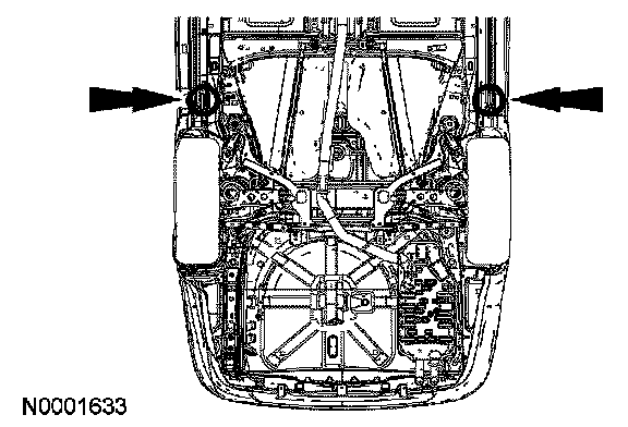 CAUTION: Do not allow the lift arms, pads or adapters to contact the front or rear control arms, halfshafts, front wheel constant velocity (CV) joints, steering linkage, stabilizer bar, or compress the stabilizer bar link insulators. Damage to suspension, exhaust and steering linkage components may occur if care is not exercised when positioning the lift adapters prior to lifting the vehicle.