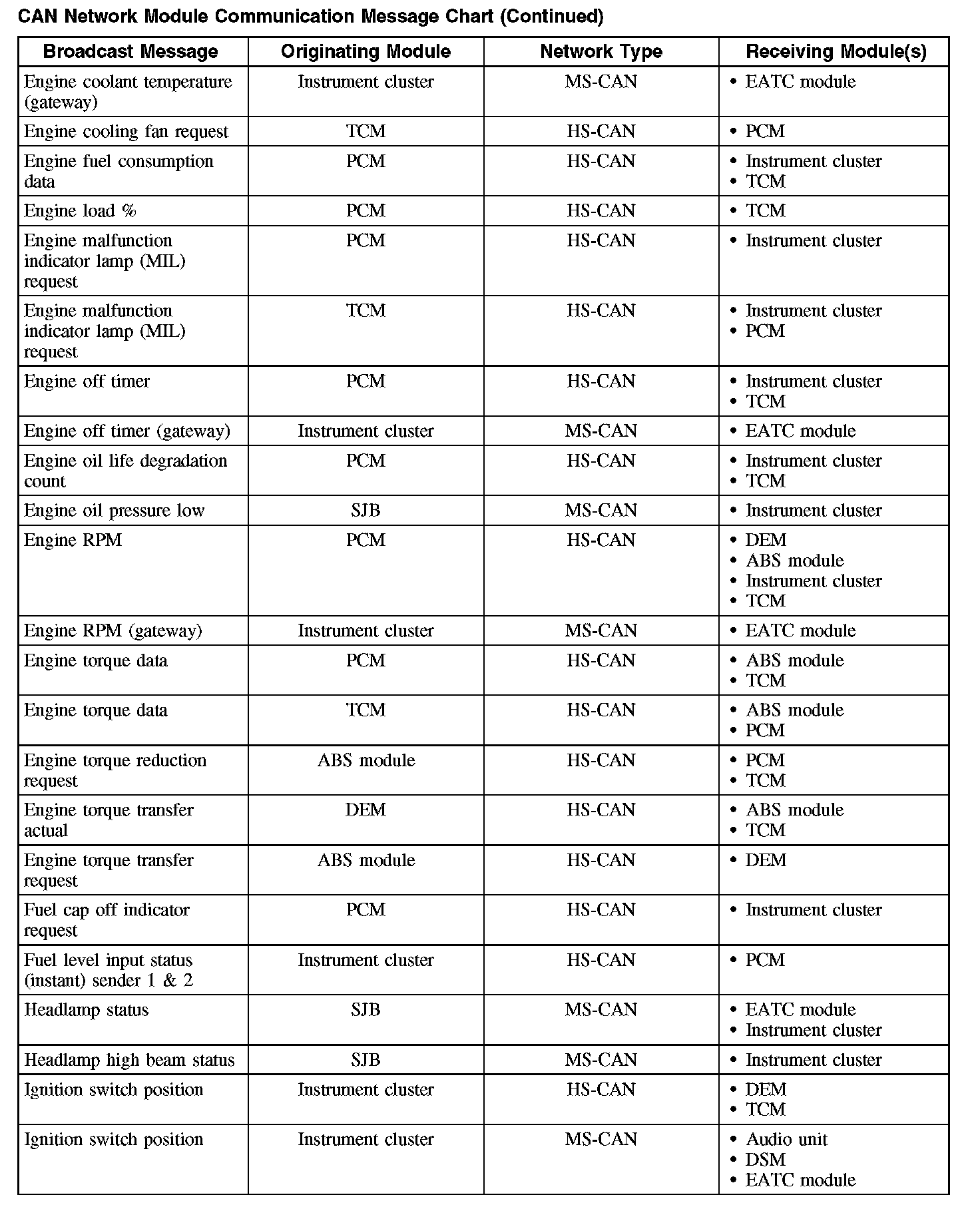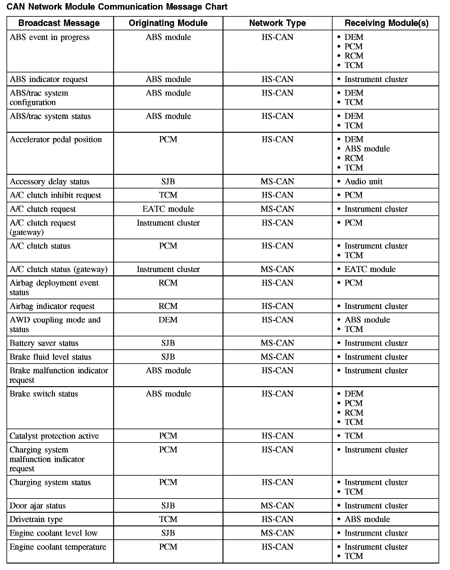 The chart describes the specific CAN network messages broadcast by each module, and the module(s) that receive the message.