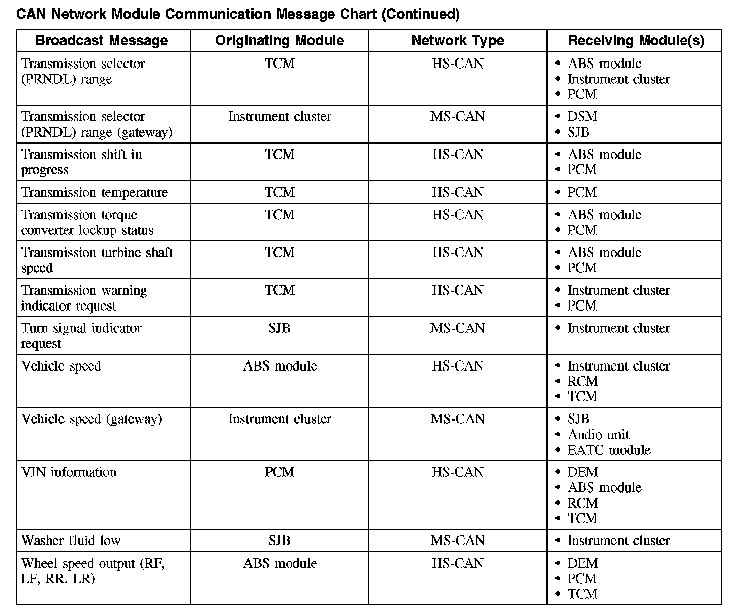The HS-CAN network uses an unshielded twisted pair cable of data (+) and data (-) circuits. The data (+) and the data (-) circuits are each regulated to approximately 2.5 volts during neutral or rested network traffic. As bus messages are sent on the data (+) circuit, voltage is increased by approximately 1.0 volt. Inversely, the data (-) circuit is reduced by approximately 1.0 volt when a bus message is sent. Multiple bus messages can be sent over the network CAN circuits allowing multiple modules to communicate with each other. The HS-CAN is a high speed communication network used for the instrument cluster, the powertrain control module (PCM), the transmission control module (TCM), the differential electronic module (DEM), the restraints control module (RCM), and the anti-lock brake system (ABS) module communications, and designed for real time information transfer and control. The HS-CAN network will not communicate while certain faults are present, but will operate with diminished performance with other faults present. The HS-CAN bus may remain operational when 1 of the 2 termination resistors are not present.