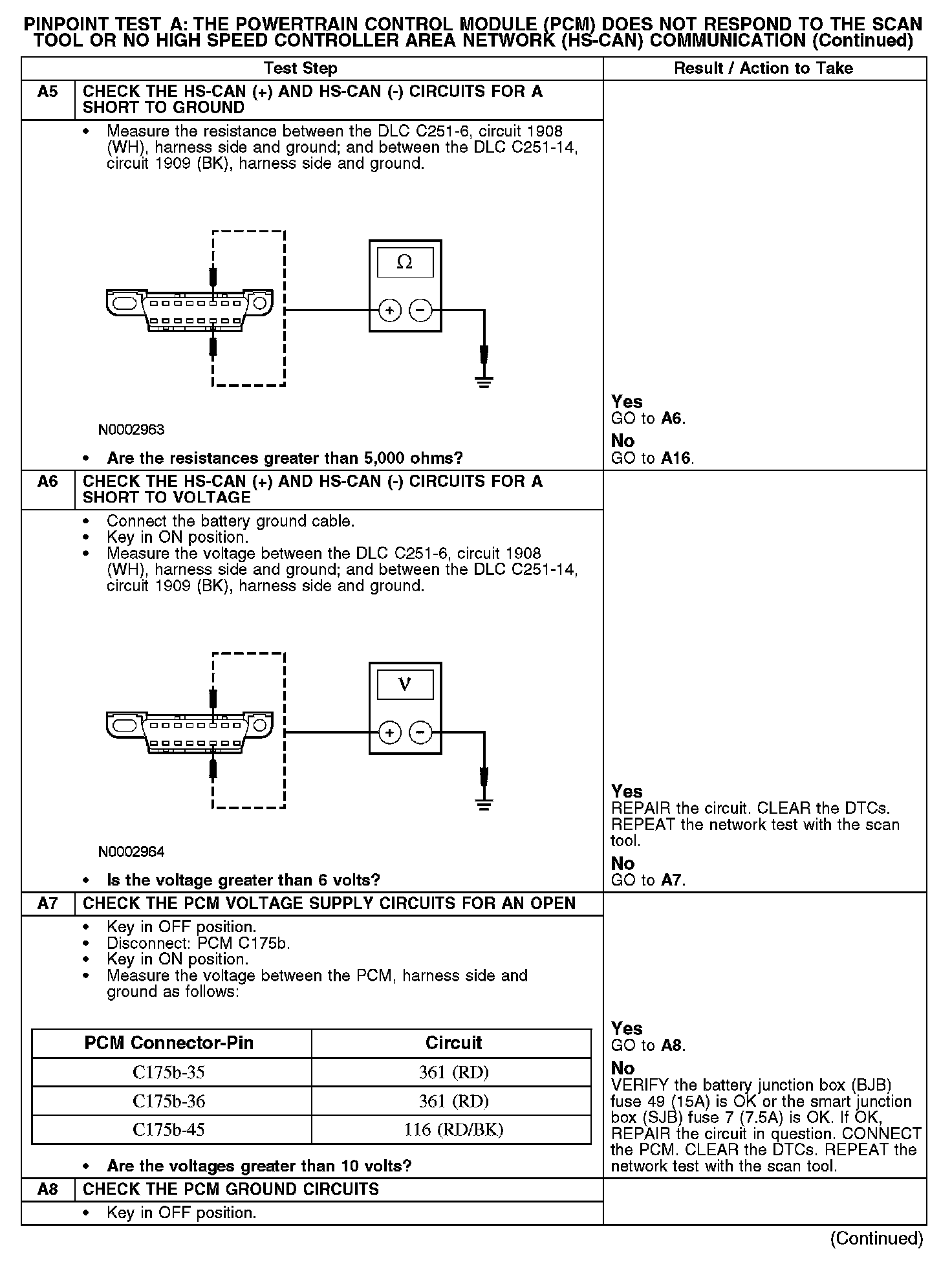 PINPOINT TEST A: THE POWERTRAIN CONTROL MODULE (PCM) DOES NOT RESPOND TO THE SCAN TOOL, OR NO HIGH SPEED CONTROLLER AREA NETWORK (HS-CAN) COMMUNICATIONA1-A2: