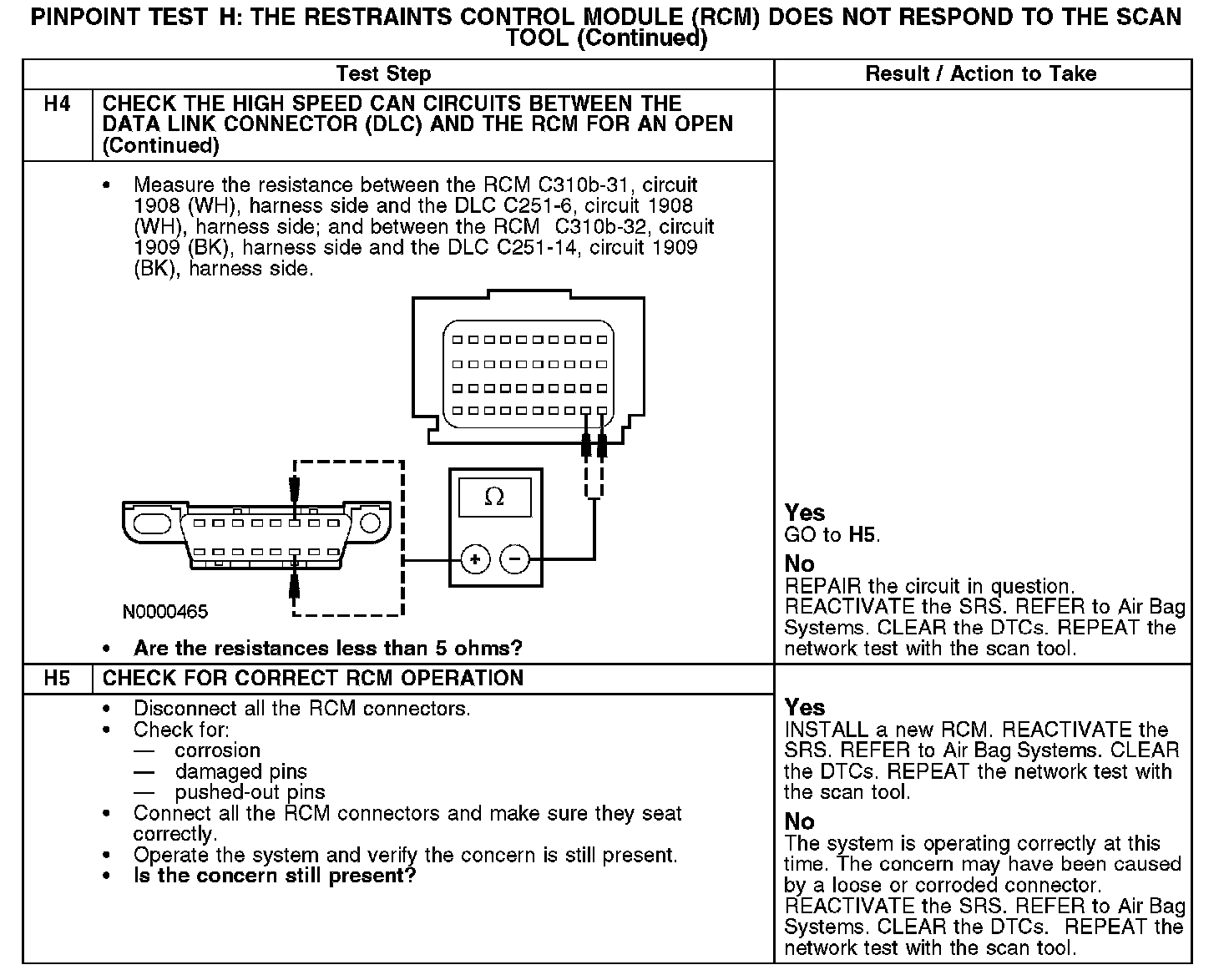 PINPOINT TEST H: THE RESTRAINTS CONTROL MODULE (RCM) DOES NOT RESPOND TO THE SCAN TOOLH1-H4:
