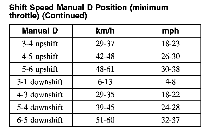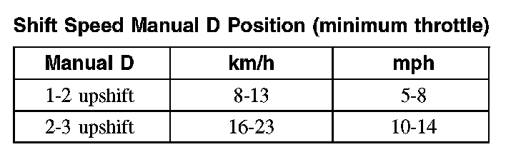 Shift Speed Manual D Position (minimum throttle):