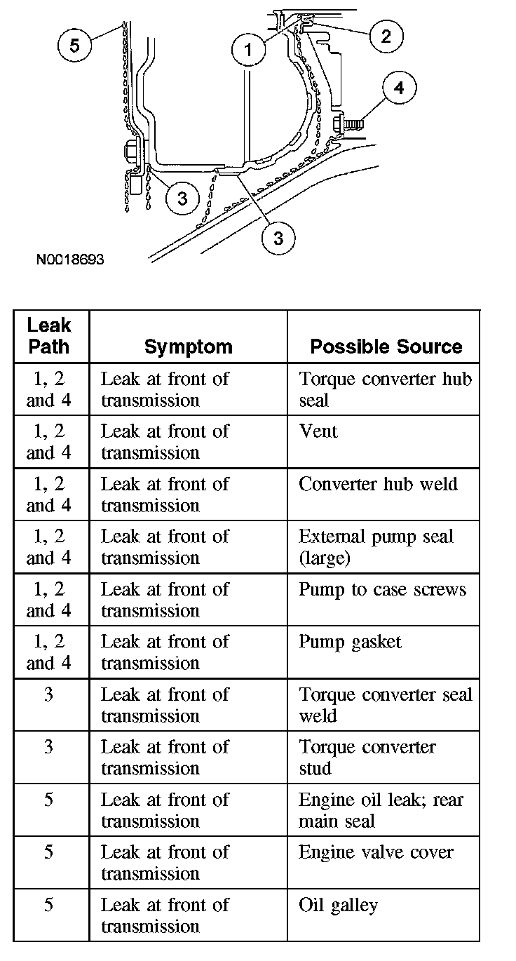 Leakage at the front of the transmission, as evidenced by fluid around the torque converter housing part of the case, may have several sources. By careful observation it is possible, in many instances, to pinpoint the source of the leak before removing the transmission from the vehicle. The paths which the fluid takes to reach the bottom of the torque converter housing are shown in the illustration. The 5 numbers in the illustration correspond with the 5 flow path steps.