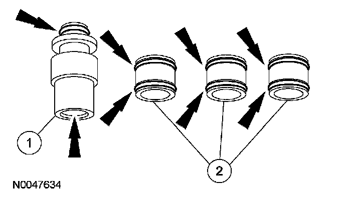 For transaxles built before December 6, 2005, lubricate the new O-ring seals with clean CVT transmission fluid. Install the O-ring seals on the feed tubes (late build vehicles).
