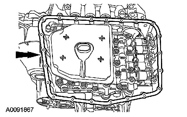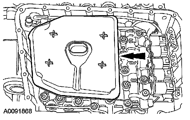 CAUTION: Make sure that the transmission fluid filter is fully seated into the bore. If the filter is not correctly installed, internal transaxle damage will occur. Lubricate the seal that is on the new filter with clean CVT transmission fluid and install the fluid filter.