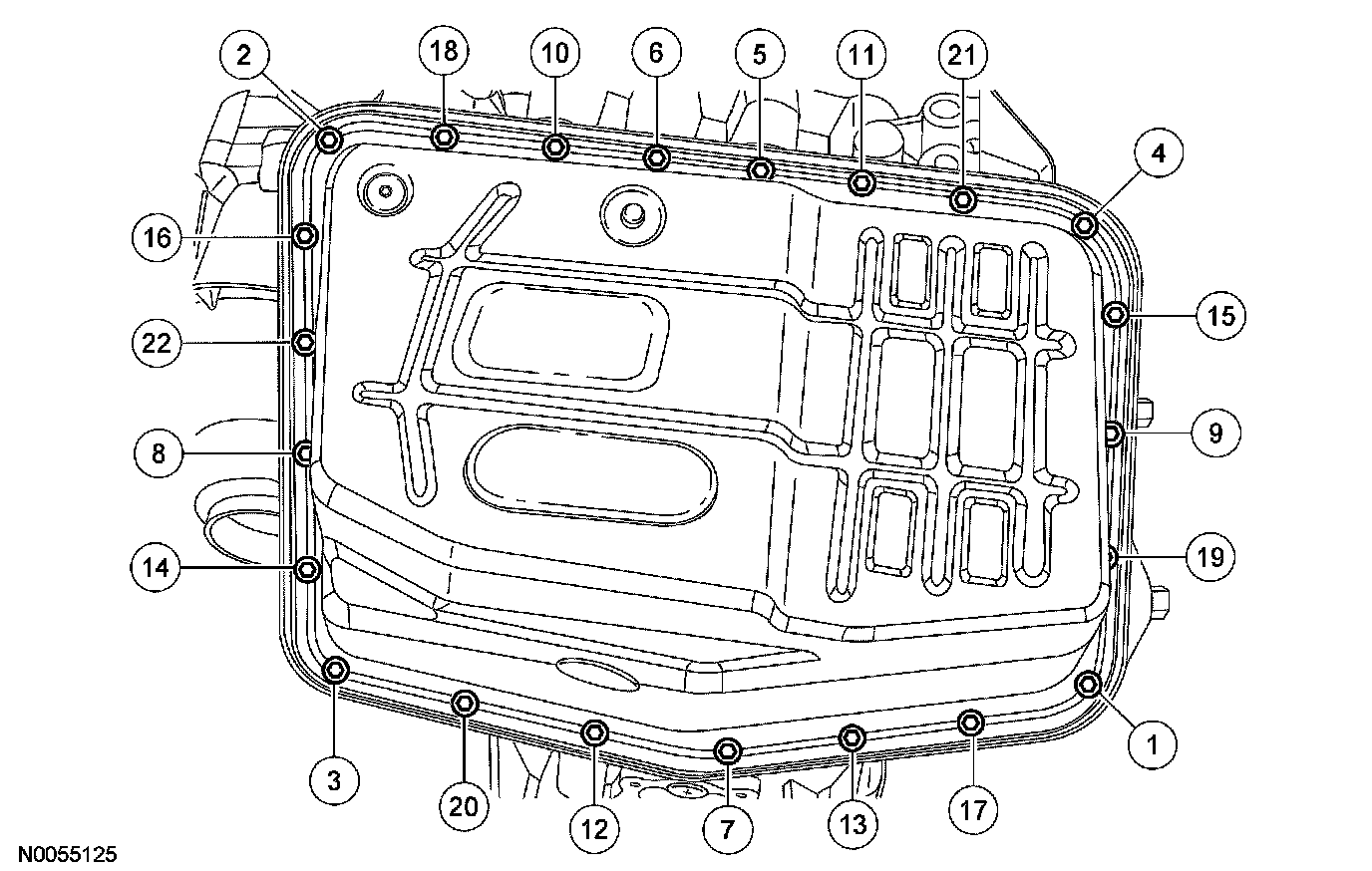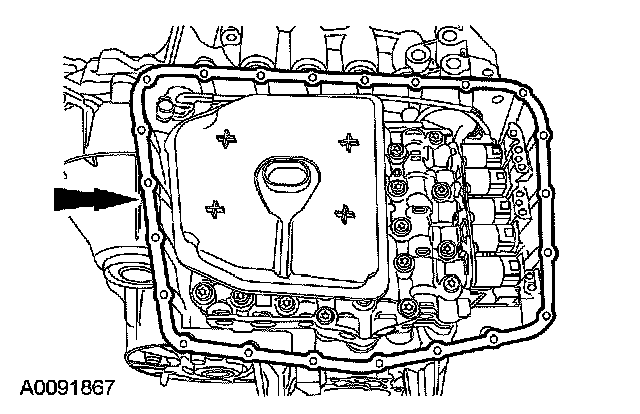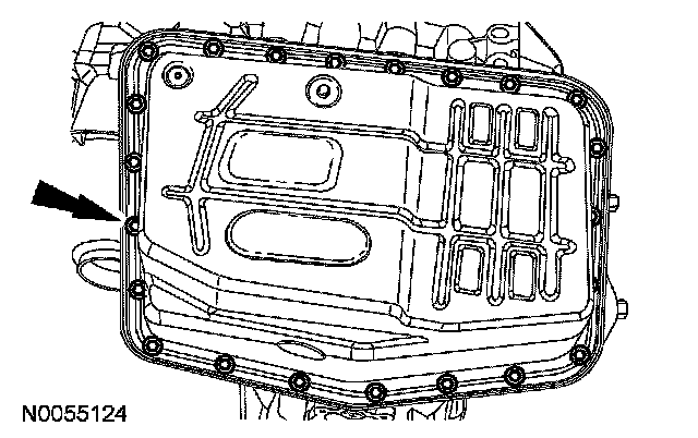 4. Remove the transmission fluid pan bolts and the transmission fluid pan.