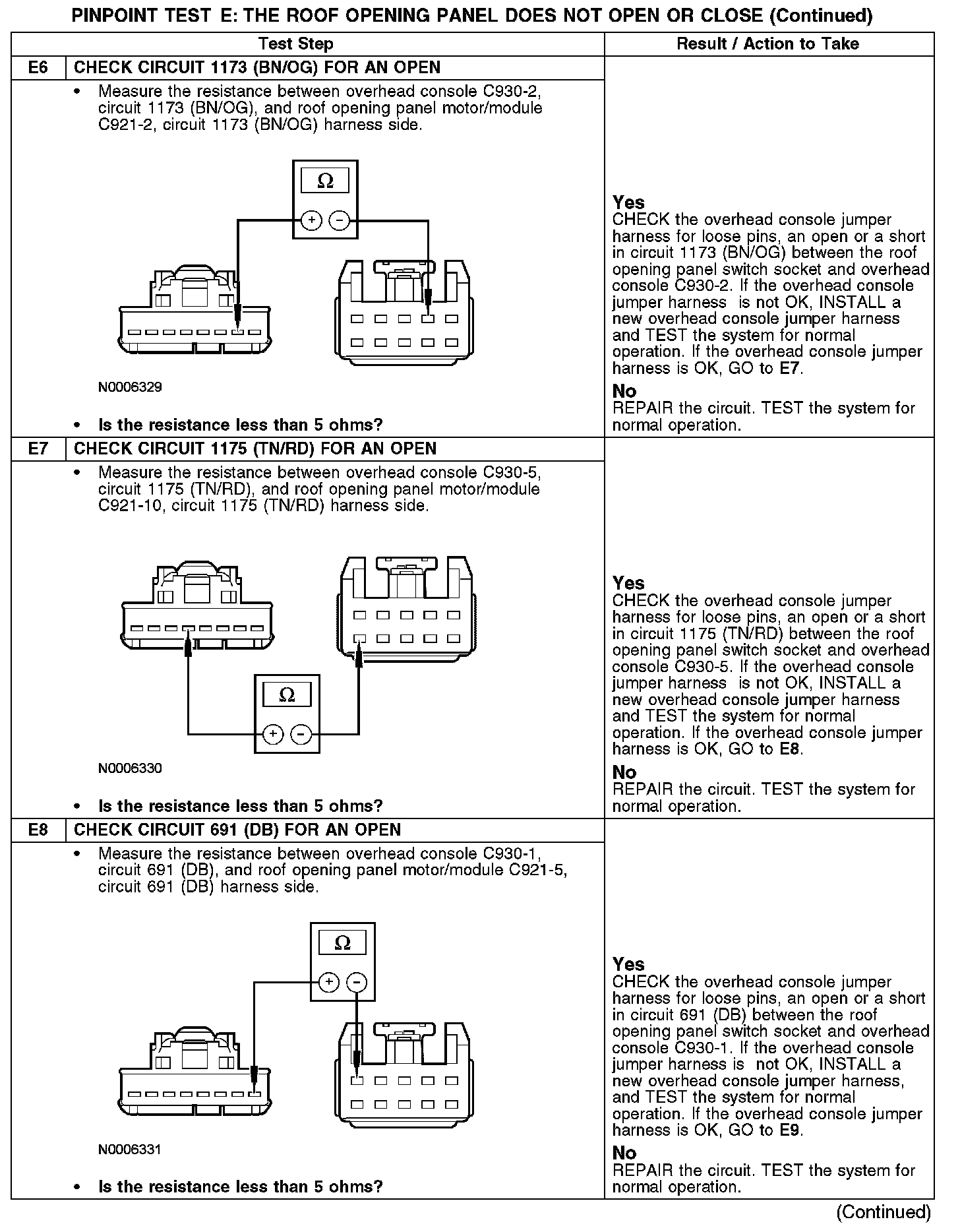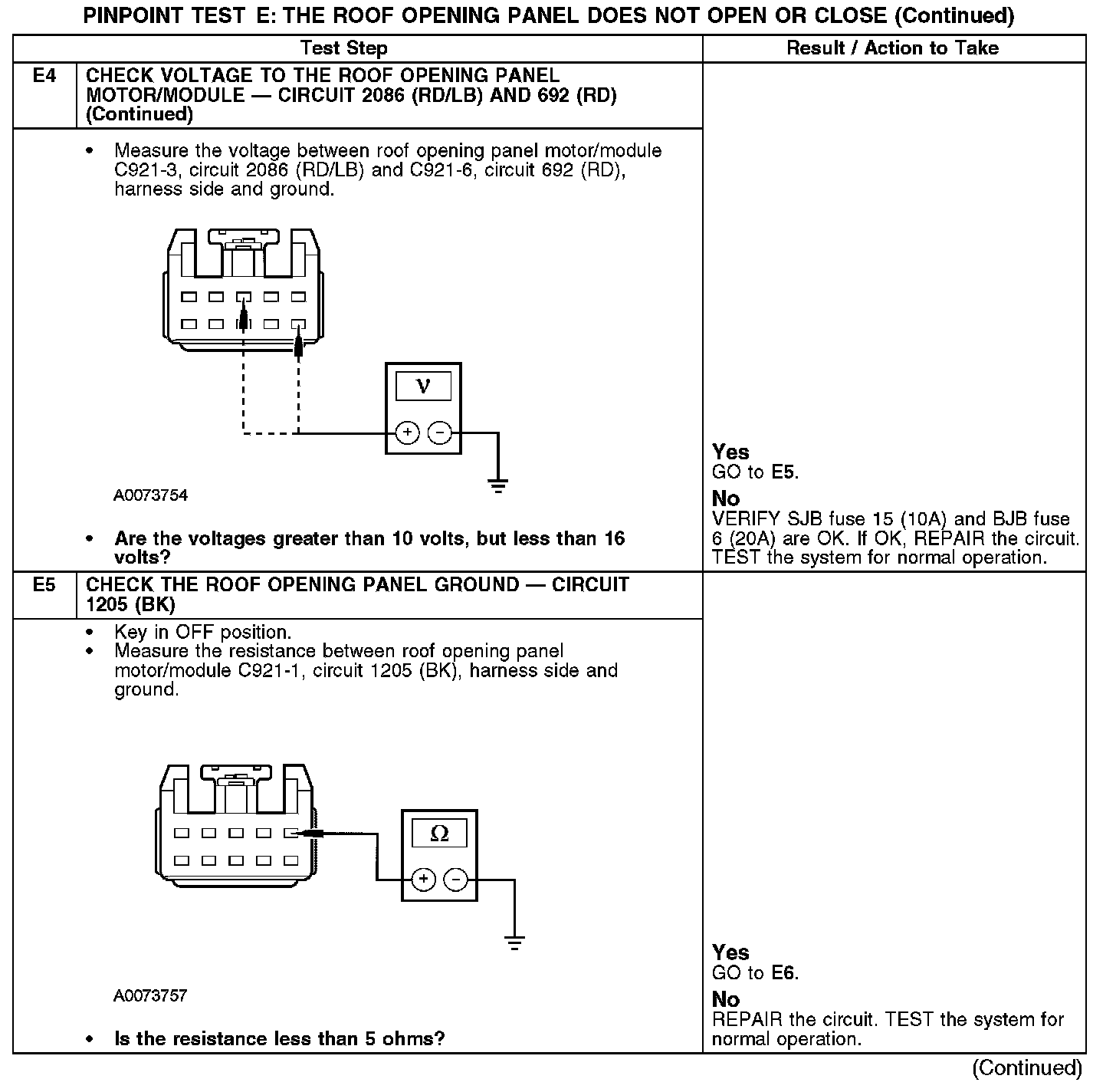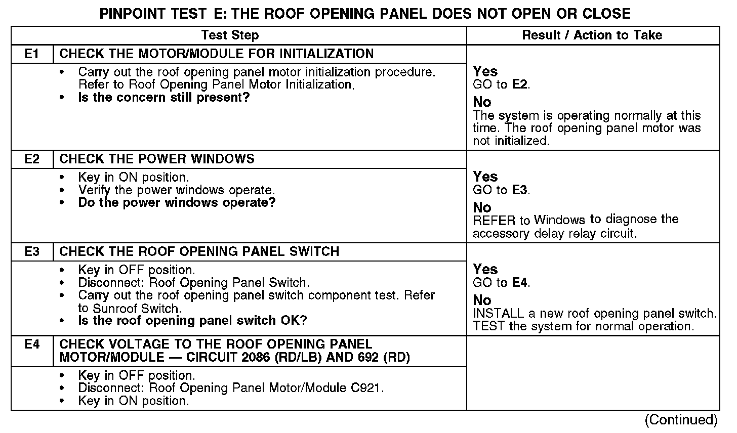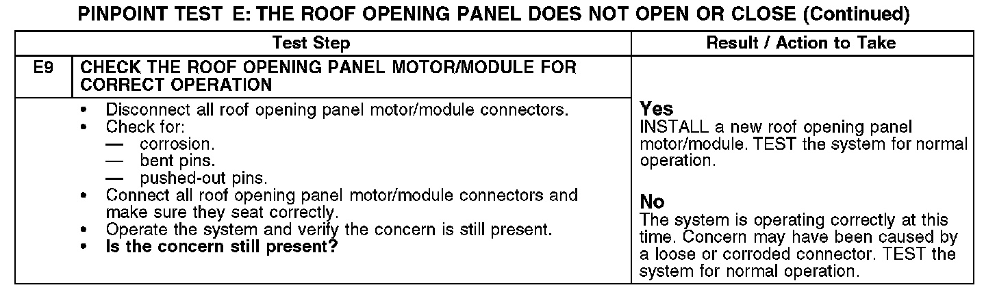 PINPOINT TEST E: THE ROOF OPENING PANEL DOES NOT OPEN OR CLOSEThe roof opening panel motor must be initialized when repairs are carried out on any part of the roof opening panel system, including: whenever the roof opening panel motor has been removed from the roof opening panel system, the roof opening panel glass has been removed from the roof opening panel system, the roof opening panel assembly has been removed from the vehicle, a new roof opening panel motor has been installed, a new roof opening panel glass has been installed or a new roof opening panel assembly has been installed. Refer to Roof Opening Panel Motor Initialization. Programming and Relearning