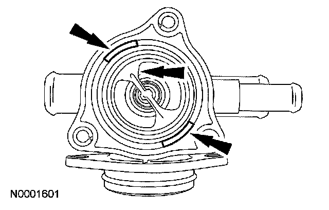 1.CAUTION: The thermostat bridge must be aligned to the marks in the upper thermostat housing so that the spring retainer of the thermostat does not block the coolant inlet tube.